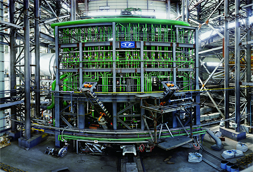 是一種熔融還原煉鐵裝置。該設備包含的部分有筒體、渣區(qū)冷卻壁和前置爐。筒體包含爐體段和煤氣室,直段直徑為Φ9280mm。煤氣室直徑為Φ5260