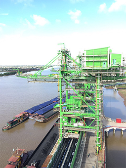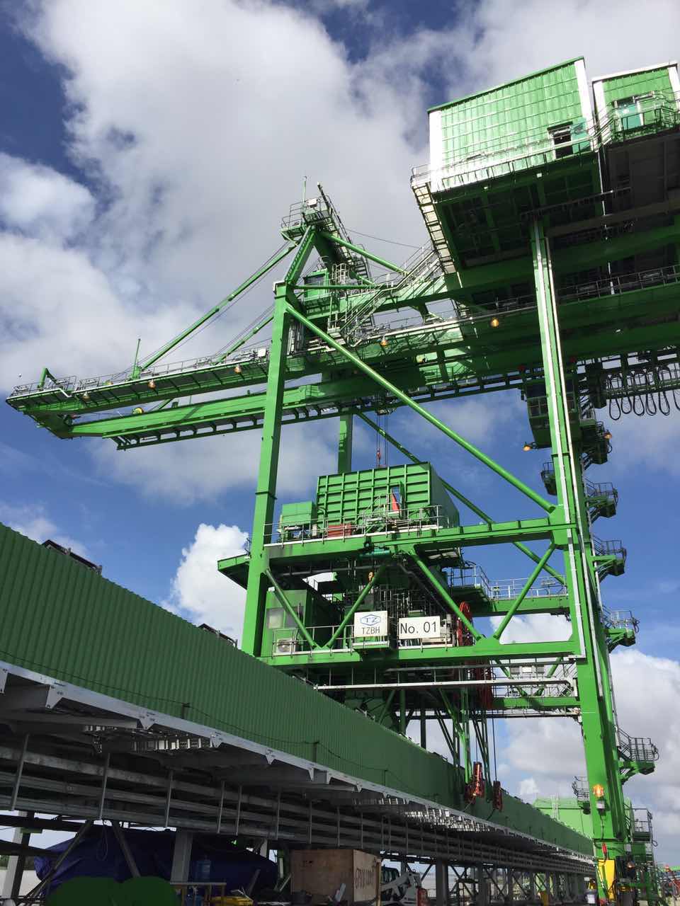 橋式抓斗卸船機,以帶有抓斗的小車沿橋架作周期運行的散貨卸船機。作業(yè)時,抓斗自船艙抓取散貨并提升出倉后載重小車向岸方運行,將散貨卸入前門框內的漏斗內,經膠帶輸送機系統(tǒng)送入貨場。