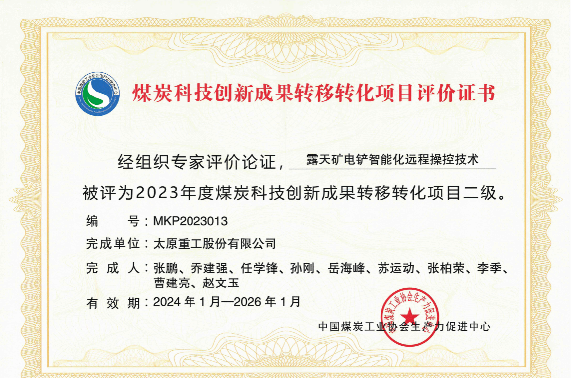 近日,公司“露天礦電鏟智能化遠(yuǎn)程操控技術(shù)”成果,在中國煤炭工業(yè)協(xié)會(huì)生產(chǎn)力促進(jìn)中心組織的2023年度煤炭科技創(chuàng)新成果轉(zhuǎn)移轉(zhuǎn)化項(xiàng)目評(píng)價(jià)中,被評(píng)為煤炭科技創(chuàng)新成果轉(zhuǎn)移轉(zhuǎn)化項(xiàng)目二級(jí)。