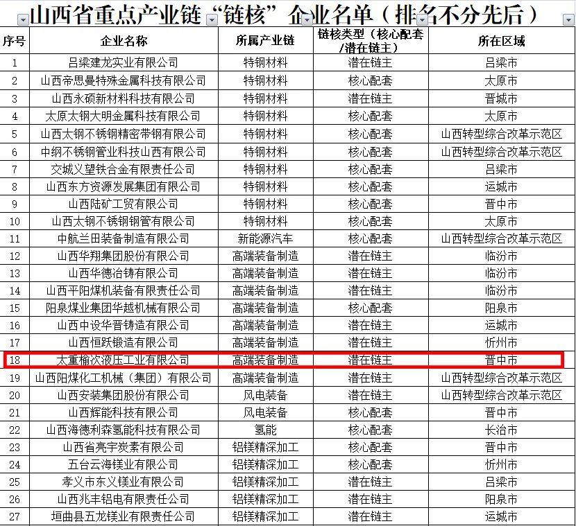 近日,山西省工業(yè)和信息化廳公示了山西省重點產(chǎn)業(yè)鏈“鏈核”企業(yè)名單,太重集團(tuán)榆次液壓工業(yè)有限公司成功上榜高端裝備制造產(chǎn)業(yè)鏈潛在鏈主企業(yè),即高端裝備制造產(chǎn)業(yè)鏈“鏈核”企業(yè)。