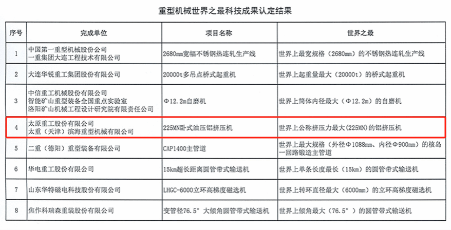 近日,中國重型機(jī)械工業(yè)協(xié)會組織認(rèn)定的“重型機(jī)械世界之最科技成果”名單出爐,由太重自主設(shè)計(jì)研發(fā)的“225MN臥式鋁擠壓機(jī)”成功入選,再次展現(xiàn)了太重在鍛壓設(shè)備領(lǐng)域無可爭議的領(lǐng)先地位。