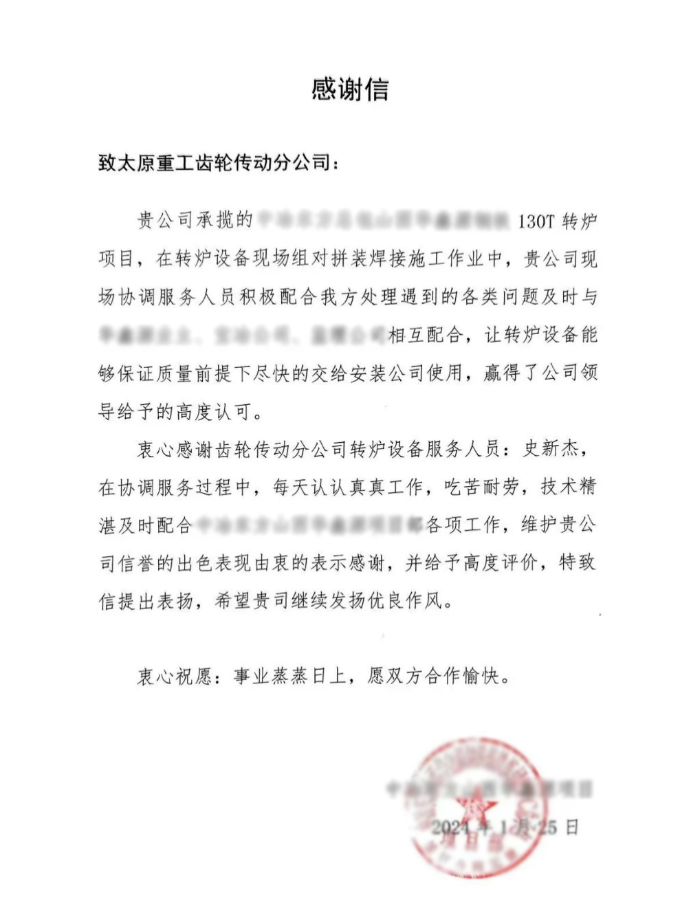 一封感謝信,不過百字,寫出來的是對太重滿滿的謝意,道不盡的是對太重深深的信任。此次項目的順利完成,再次證明了太重在轉(zhuǎn)爐制造領(lǐng)域的雄厚實力和專業(yè)水平。公司將繼續(xù)聚焦新質(zhì)生產(chǎn)力,在做好產(chǎn)品、做好服務(wù)的基礎(chǔ)上,加大科技研發(fā)力度,攻克關(guān)鍵核心技術(shù),用新技術(shù)改造提升傳統(tǒng)產(chǎn)業(yè),積極促進產(chǎn)業(yè)高端化、智能化、綠色化發(fā)展,為建設(shè)制造強國貢獻太重力量。