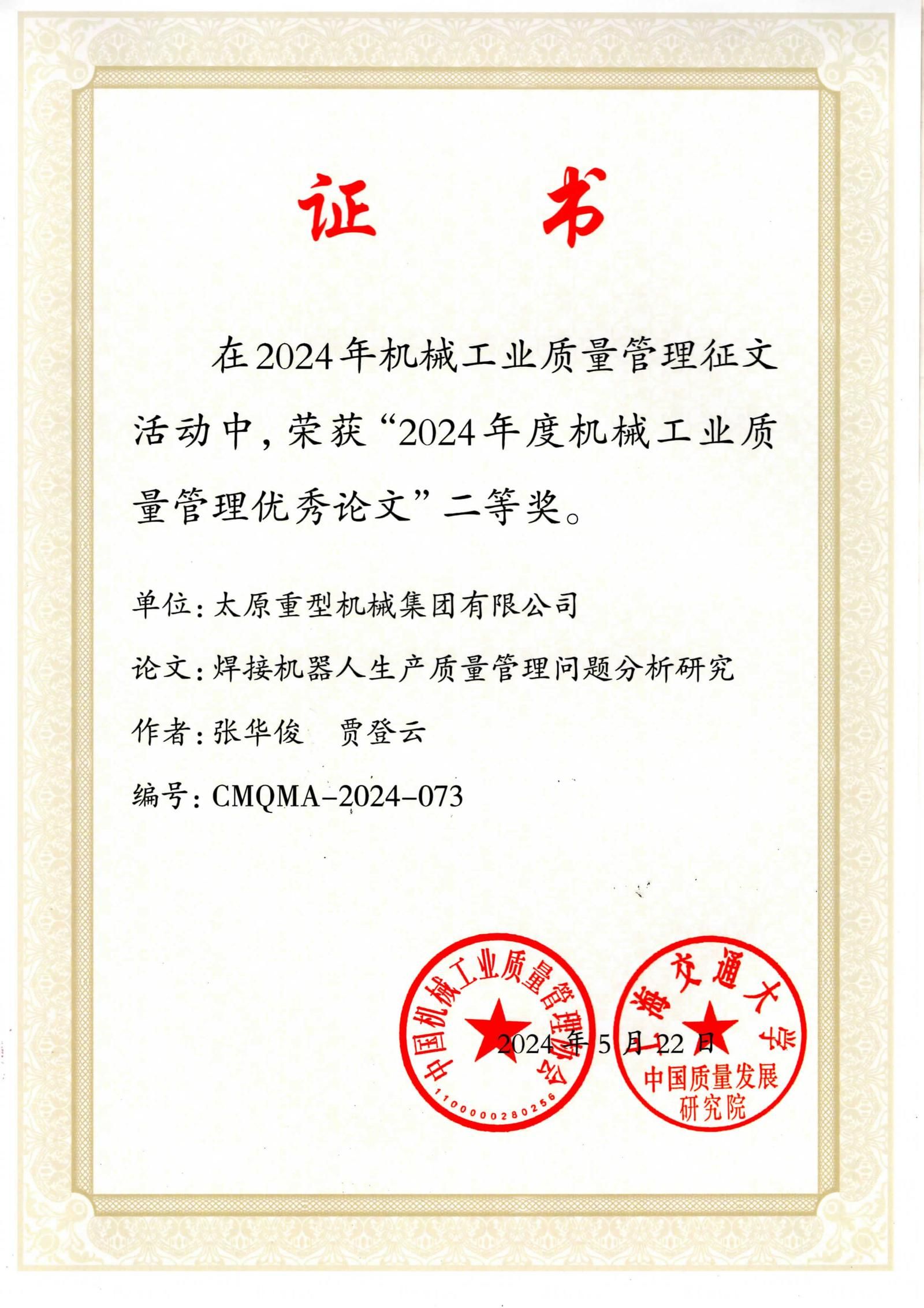 近日,中國機械工業(yè)質(zhì)量管理協(xié)會與上海交通大學(xué)中國質(zhì)量發(fā)展研究院聯(lián)合發(fā)布了“關(guān)于表彰機械工業(yè)質(zhì)量管理優(yōu)秀論文的決定”。在這次備受關(guān)注的評選中,太重集團憑借卓越的質(zhì)量管理研究與實踐成果,榮獲3項二等獎和4項三等獎。