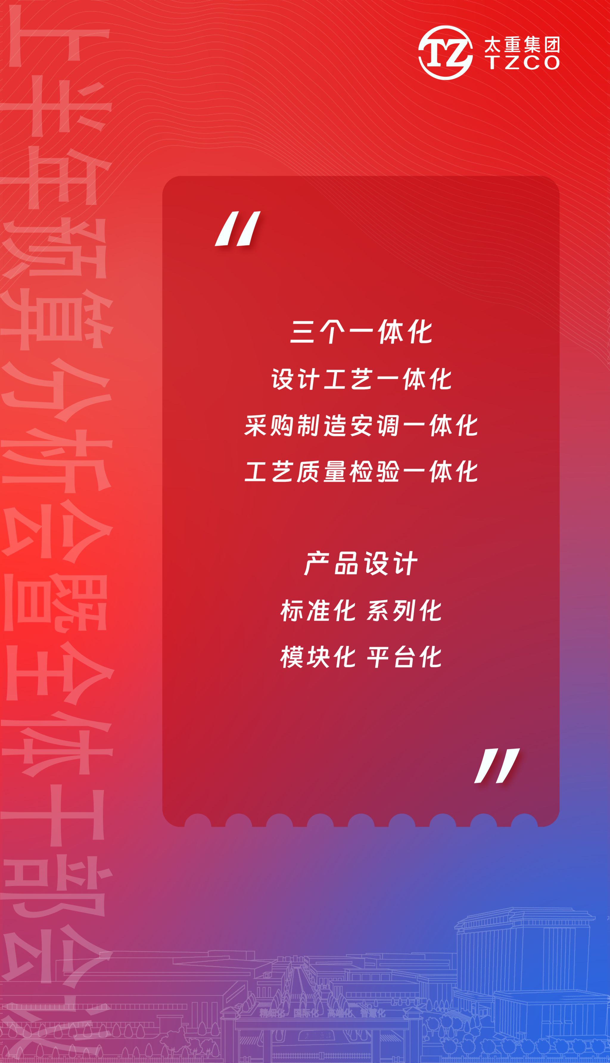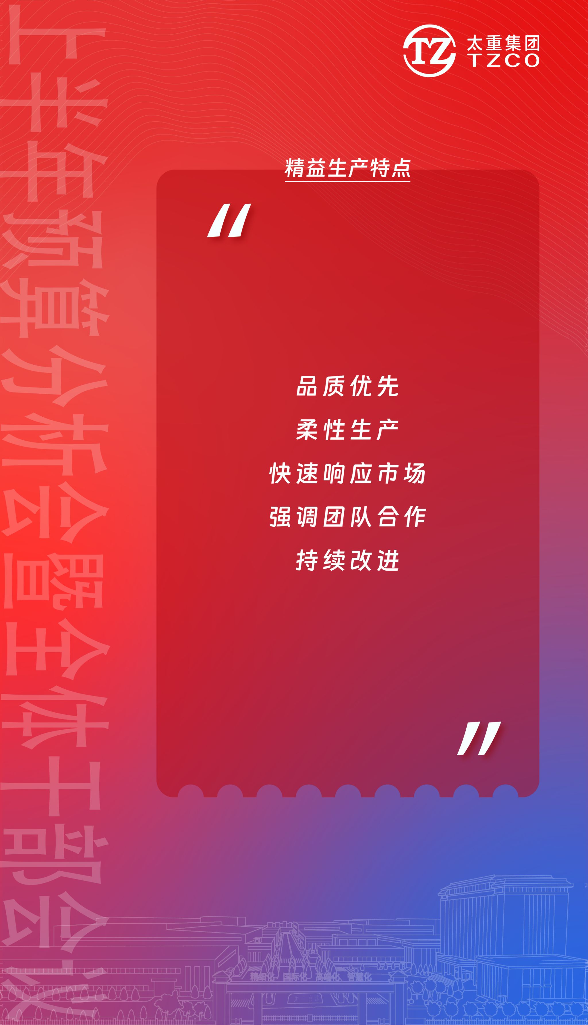 精益制造!制造精品!其理念就是為用戶提供更多的產(chǎn)品價值,以“精益制造”理念貫穿公司高質(zhì)量高速度發(fā)展之路,是所有太重人的必修課。