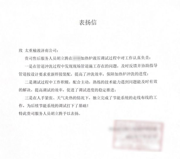 一封表揚信,對公司售后服務(wù)人員專業(yè)的技術(shù)、敬業(yè)的精神予以高度贊揚。為用戶交付設(shè)備后,安裝調(diào)試工作時間緊、任務(wù)重,公司立即派出經(jīng)驗豐富的售后專員奔赴用戶現(xiàn)場,扎根作業(yè)一線、克服高溫酷暑,幫助用戶完成節(jié)能系統(tǒng)安裝以及電控的布線走線工作,與此同時,還對用戶的管路沖洗方案進行優(yōu)化,為用戶提供切實可行的解決方案,提出專業(yè)建議,最大程度保障了用戶利益。