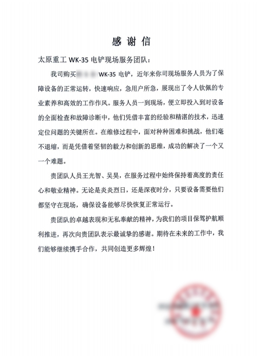 熱忱的服務(wù)態(tài)度和精湛的技術(shù)水平深受用戶贊賞:“方向準(zhǔn)、行動快、效果實(shí)!我們見證了太重速度,體會了太重服務(wù),讓人十分信賴。”用戶多次在現(xiàn)場感慨道。帶著感情去工作,帶著責(zé)任去執(zhí)行。每一封感謝信與每一面錦旗,都流露出用戶對公司卓越服務(wù)的認(rèn)可與贊譽(yù)。未來,公司將不斷加大后市場的服務(wù)力度,優(yōu)化服務(wù)流程、提升服務(wù)質(zhì)量、提供最優(yōu)解決方案,以超預(yù)期的服務(wù)與價(jià)值持續(xù)加強(qiáng)產(chǎn)品核心競爭力。