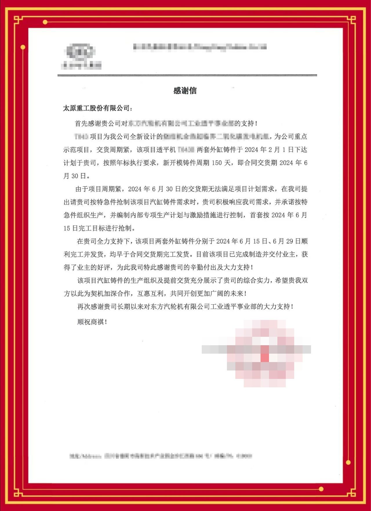 金杯銀杯,不如用戶的口碑!近日,公司收到一封來自四川省某用戶的表揚(yáng)信,信中對公司積極響應(yīng)用戶需求、高效完成交付任務(wù)給予了高度的肯定和認(rèn)可,不僅鞏固了雙方長期穩(wěn)定的合作關(guān)系,更為未來的深入合作奠定了堅(jiān)實(shí)基礎(chǔ)。