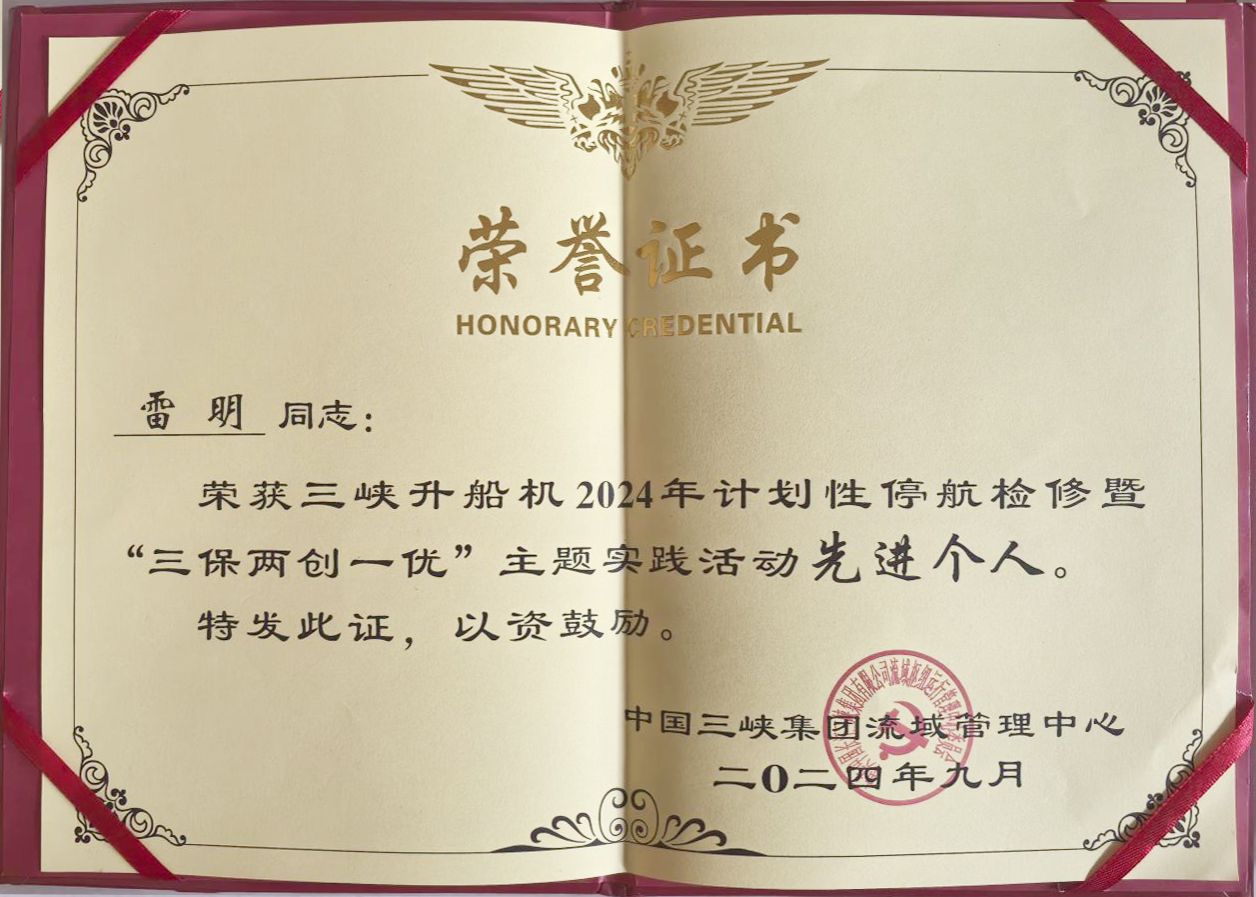 在三峽升船機(jī)2024年計(jì)劃性停航檢修項(xiàng)目總結(jié)大會(huì)上,公司服務(wù)人員雷明被評(píng)為“先進(jìn)個(gè)人”稱(chēng)號(hào)。這是他在2023年獲得用戶表彰后,連續(xù)第二年斬獲此項(xiàng)榮譽(yù)!爭(zhēng)分奪秒保工期,不遺余力趕進(jìn)度。本次檢修是三峽升船機(jī)通航以來(lái)的第四次停航檢修,為期35天,工期緊、任務(wù)重、難度高、風(fēng)險(xiǎn)大,為確保如期完成檢修任務(wù),太重榆液精心組織、周密安排,積極做好人員、檢修工器具、材料及設(shè)備設(shè)施等各項(xiàng)準(zhǔn)備工作,針對(duì)本次檢修的重難點(diǎn)制定了切實(shí)可行的專(zhuān)項(xiàng)施工方案和安全方案。在施工過(guò)程中,公司合理組織調(diào)配資源,落實(shí)技術(shù)細(xì)節(jié)要求,圓滿高效地完成了各項(xiàng)檢修任務(wù),質(zhì)量、安全、進(jìn)度均達(dá)到要求,“太重速度”為我國(guó)三峽項(xiàng)目的平穩(wěn)運(yùn)行再立新功!
