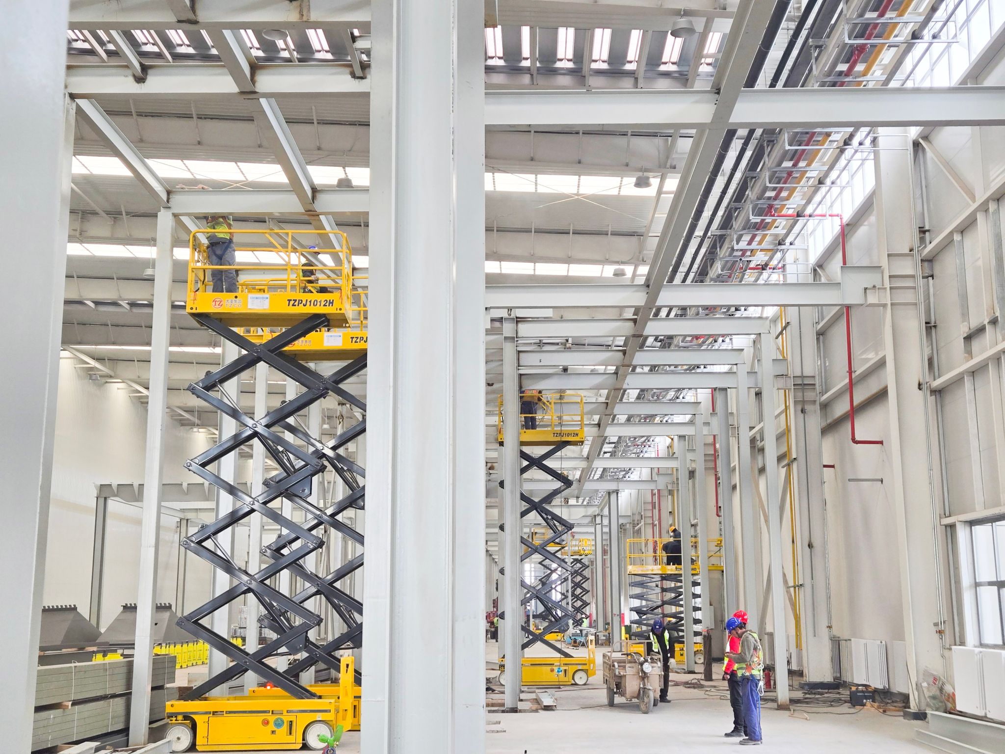 高端產(chǎn)線亮點(diǎn)紛呈,太重裝備在其中忙得“不亦樂(lè)乎”。聯(lián)合廠房?jī)?nèi),太重研制的高空作業(yè)平臺(tái)隨處可見(jiàn),隨車起重機(jī)更是以其靈活的特性在廠房完善中發(fā)揮著關(guān)鍵作用。一位現(xiàn)場(chǎng)施工人員感慨道:“太重直臂車、剪叉車成為我們的得力幫手,用自己的一流產(chǎn)品,造自己的一流園區(qū),相信園區(qū)建成之后,太重工程起重機(jī)產(chǎn)品的性能只會(huì)更好!”