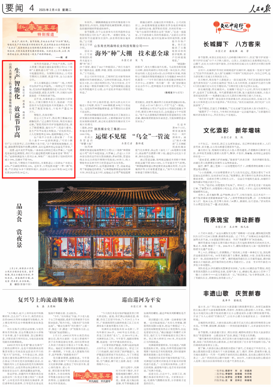 新春伊始,萬象更新,太重以亮眼開局備受矚目,榮登媒體熱榜。生產(chǎn)智能化、效益節(jié)節(jié)高!2月4日,人民日報(bào)《新春走基層·特別報(bào)道》走進(jìn)軌道交通行業(yè)首座“燈塔工廠”——太重軌道公司車輪廠二線,感受智能化生產(chǎn)的澎湃脈動(dòng)。數(shù)據(jù)見證非凡成就:勞動(dòng)生產(chǎn)率提高43%,產(chǎn)品缺陷率降低33%,營業(yè)收入從2017年的18億元增長到2024年的30億元,清晰勾勒出太重向智能化大步邁進(jìn)、效益持續(xù)上揚(yáng)的堅(jiān)實(shí)步伐。2月5日,山西新聞聯(lián)播《節(jié)后上班首日 我省各地奮進(jìn)“春天里”》欄目也將鏡頭對準(zhǔn)太重工程起重機(jī)項(xiàng)目建設(shè)現(xiàn)場,工人們忙碌而有序,大型機(jī)械轟鳴作響,努力打造高端裝備制造雙鏈雙千億產(chǎn)業(yè)集群,彰顯太重人奮進(jìn)爭先的蓬勃朝氣與豪邁干勁!春啟新程,開局沖刺!2025,讓我們以奮斗之名,攜手共進(jìn),續(xù)寫太重新的輝煌!