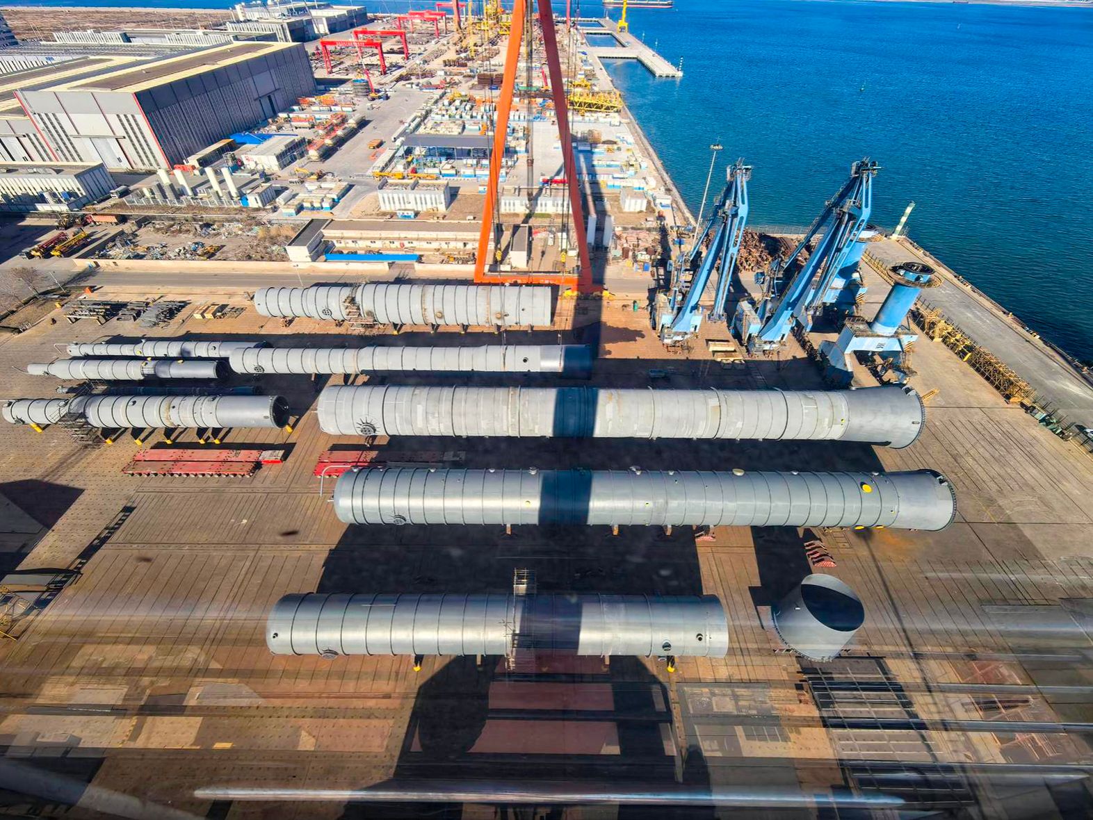 體積大、尺寸精度要求高、吊裝倒運難度大……這對制造和發(fā)運形成了巨大挑戰(zhàn)。各部門群策群力,憑借深厚的技術底蘊和豐富的研制經(jīng)驗,個性化改進工藝流程,完美適配塔筒生產(chǎn)的特殊需求。同時,公司充分發(fā)揮“前港后廠”的區(qū)位布局優(yōu)勢,統(tǒng)籌組織資源,確保每一個環(huán)節(jié)都緊密銜接、高效運轉(zhuǎn),交出了從“出廠”到“出海”的最優(yōu)解。2025年山西省政府工作報告指出,完善陸港型國家物流樞紐功能,打造“津海晉門、晉商冀港”出海通道。此次太重產(chǎn)品的高質(zhì)量交付,對于服務國家重點產(chǎn)業(yè)戰(zhàn)略布局、保障國家能源安全和產(chǎn)業(yè)安全、促進能源領域?qū)ν夂献骶哂蟹e極意義。