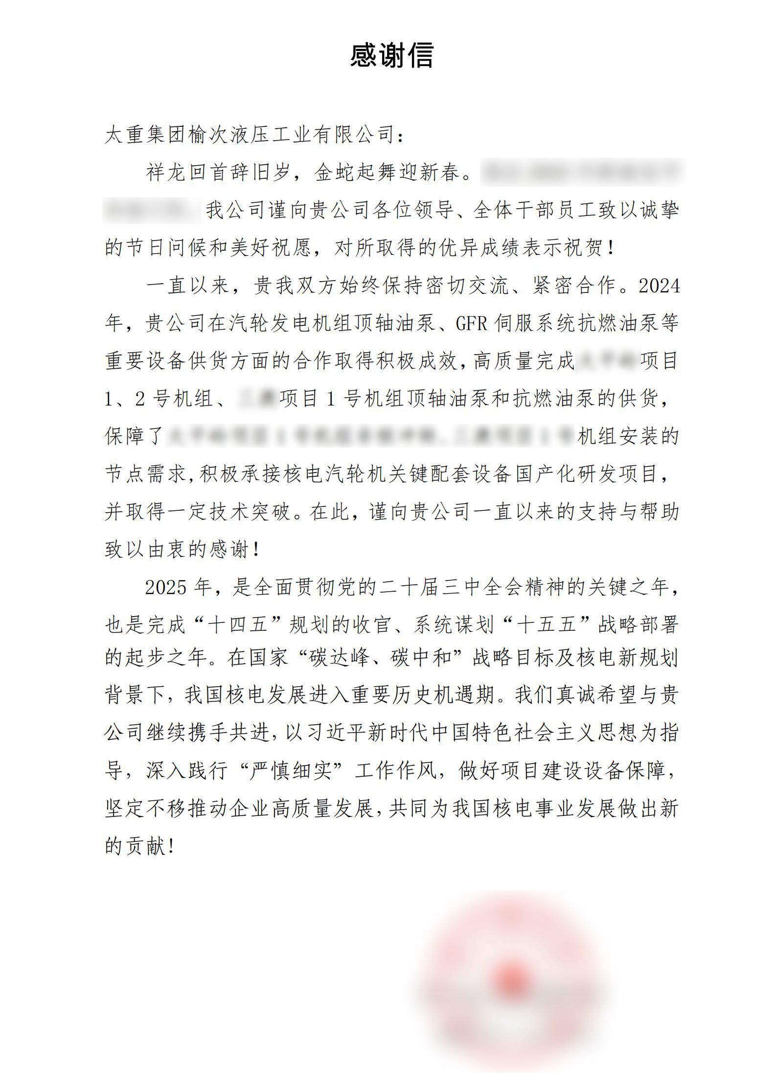 近年來,我國核電產(chǎn)業(yè)迎來重大發(fā)展機遇期,但部分關鍵設備依賴進口,不僅成本高昂,還面臨技術封鎖、供應受限等風險。該用戶在核電領域深耕多年,擁有豐富的項目經(jīng)驗和廣闊的發(fā)展前景,與太重有著多年的合作基礎。此次,太重榆液肩負重任,負責用戶汽輪發(fā)電機組頂軸油泵、GFR 伺服系統(tǒng)抗燃油泵等重要設備的研發(fā)設計工作,其性能和可靠性直接影響整個核電系統(tǒng)的安全穩(wěn)定運行。太重榆液承接此次任務,不僅是雙方深厚合作友誼的體現(xiàn),更是太重推動我國核電關鍵設備國產(chǎn)化進程貢獻力量的重要契機。交給太重,請用戶放心!自項目開工,公司面臨著多方面的挑戰(zhàn)與困難,時間緊、任務重、標準高。為用戶設計制造關鍵設備時,公司堅持自主創(chuàng)新,突破工藝瓶頸,解決了一系列技術難題,形成了一套成熟的技術工藝,實現(xiàn)了核電領域關鍵設備國產(chǎn)化技術突破,為國產(chǎn)化替代奠定了堅實基礎。在生產(chǎn)制造期間,公司不折不扣遵循“嚴之又嚴、慎之又慎、細之又細、實之又實”的核安全工作要求,各部門聯(lián)動配合,制定了詳細的進度計劃和應急預案,解決了一個又一個組織難題,攻克了一道又一道生產(chǎn)難關。目前,太重榆液研制生產(chǎn)的相關產(chǎn)品已應用在用戶多個核電項目上,為我國核電事業(yè)高質(zhì)量發(fā)展賦能。方寸之間,紙短情長。這封感謝信,不僅承載著太重為我國核電事業(yè)主動作為的無上榮光,也見證了太重用心服務用戶,全力創(chuàng)造價值的溫暖時刻,為新的一年開啟了更具力量的新篇章,鼓舞公司向著“轉型升級跨越”昂首闊步、砥礪奮進。