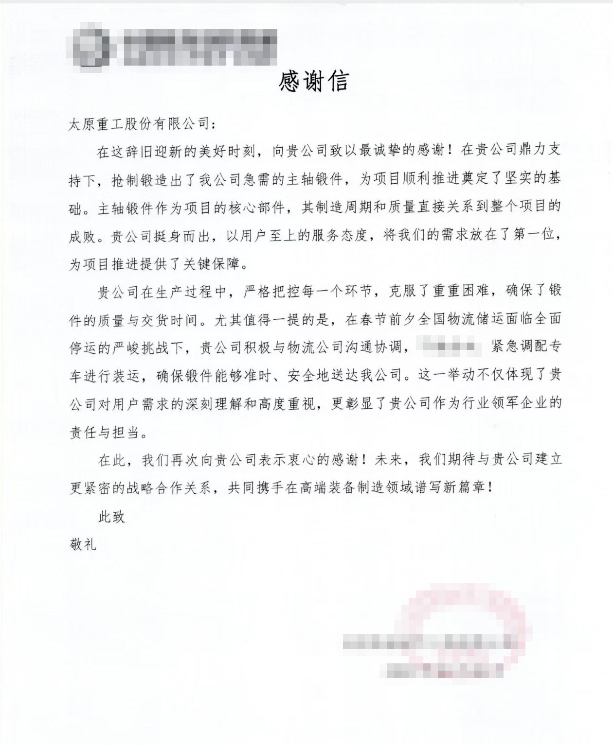 在這場緊急交付的“戰(zhàn)役”中,全體職工齊心協(xié)力、眾志成城,為用戶提供了最優(yōu)質(zhì)的產(chǎn)品及全方位的服務(wù),有力踐行了“用戶至上”的核心價值觀。這封感謝信,是太重一諾千金的見證,是用戶信任與支持太重品牌的最好詮釋。未來,公司將持續(xù)奮進,不斷提升服務(wù)質(zhì)量,深入踐行服務(wù)創(chuàng)新,以極致服務(wù)贏得用戶信賴,與合作伙伴攜手共進、互利共贏,共同書寫合作發(fā)展的新篇章。