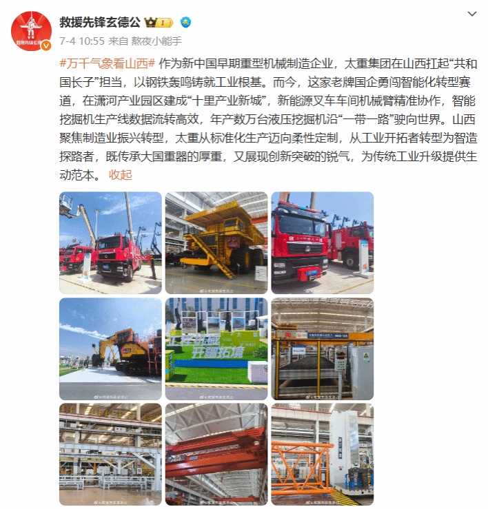 @使徒子:“太科幻了!強(qiáng)烈要求客串《流浪地球》?!?/span>@江氏小盜龍:“吹著空調(diào)去挖礦,智能化太強(qiáng)了吧!”@何春銀微想:激情賦詩《太重太?!菲哐月稍姡潎@現(xiàn)代工業(yè)的蓬勃?dú)庀蟆?/span>國家級媒體的強(qiáng)勢站臺,讓這場盛況更加出圈。新華網(wǎng)客戶端以《網(wǎng)絡(luò)名人走進(jìn)太重集團(tuán),看工業(yè)大塊頭的“智”變》為題進(jìn)行深度報道,解碼太重智變密碼。
