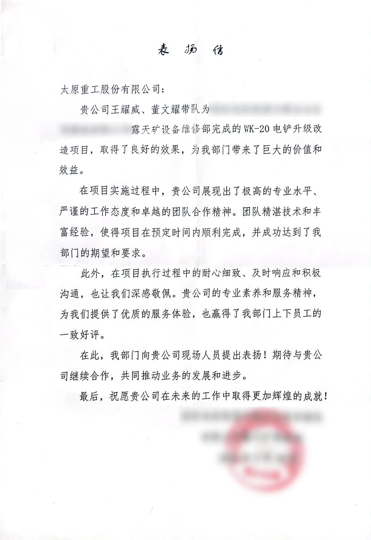 “技術(shù)精良、服務(wù)一流!見證了太重速度,感受了太重服務(wù),我們信賴”。近日,公司收到某露天煤礦用戶送來(lái)的錦旗與感謝信,對(duì)太重礦山服務(wù)團(tuán)隊(duì)的專業(yè)高效稱贊有加。