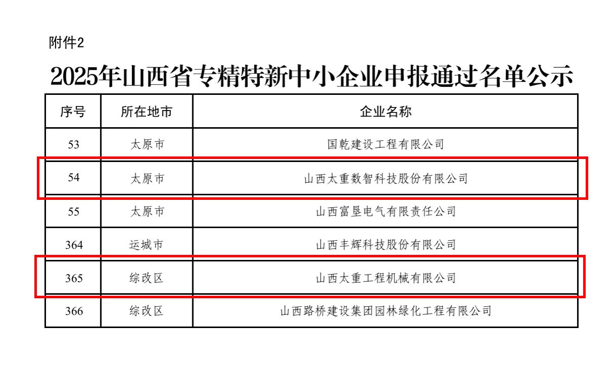 近日,山西省2025年專精特新中小企業(yè)名單正式公布,山西太重數(shù)智科技股份有限公司、山西太重工程機械有限公司雙雙上榜!至此,太重省級專精特新中小企業(yè)已達10家!