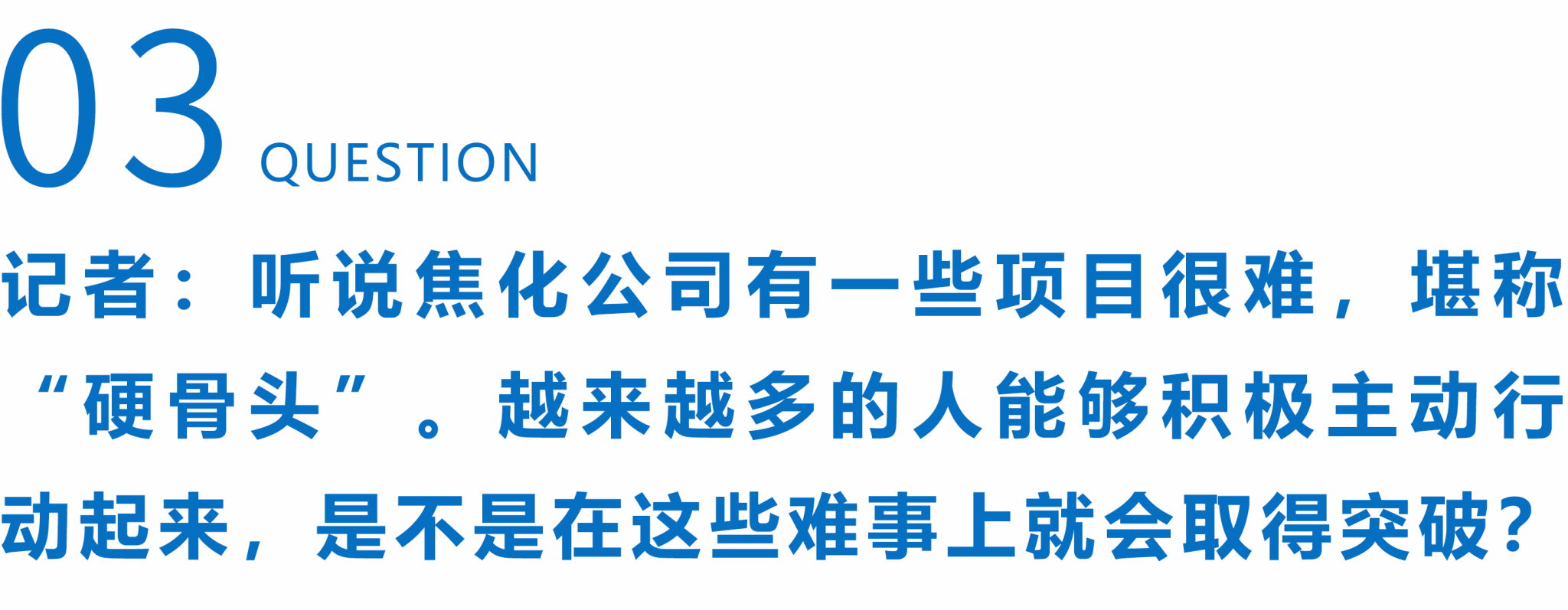 受到環(huán)境影響,焦化公司的干部職工狀態(tài)比較被動,對于我們“能不能行”有焦慮,接受任務(wù)、完成任務(wù)的過程中有思想包袱。所以我們做的第一件事就是為大家卸下包袱,給大家講清楚挑戰(zhàn)和機遇,鼓舞大家的士氣。同時我們把資源向積極主動、擔(dān)當(dāng)作為的人傾斜,從精神和物質(zhì)兩個方面激勵大家。