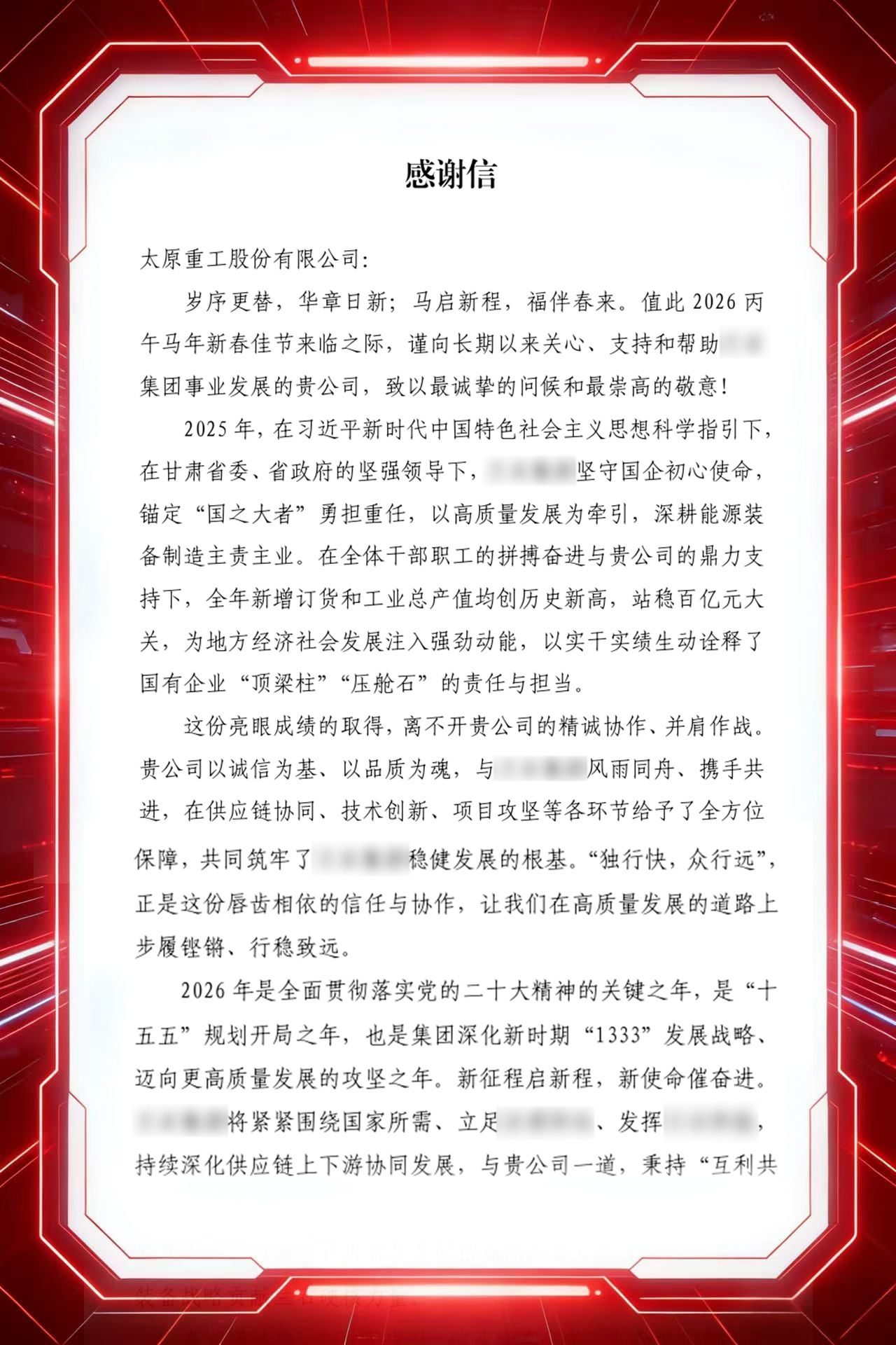 急用戶之所急,想用戶之所想。這封感謝信,字字句句飽含著用戶的誠摯謝意,是鑄鍛件分公司與用戶戰(zhàn)略合作共贏成果的有力見證。從常規(guī)鑄件到800t鋼水超大型鑄件的攻堅突破,在一次次緊密協(xié)作,在一次次高質(zhì)量交付的考驗中,與用戶形成了互信互助、攜手共進的良好格局,共同為地方重大工程實施和產(chǎn)業(yè)高質(zhì)量發(fā)展貢獻力量。