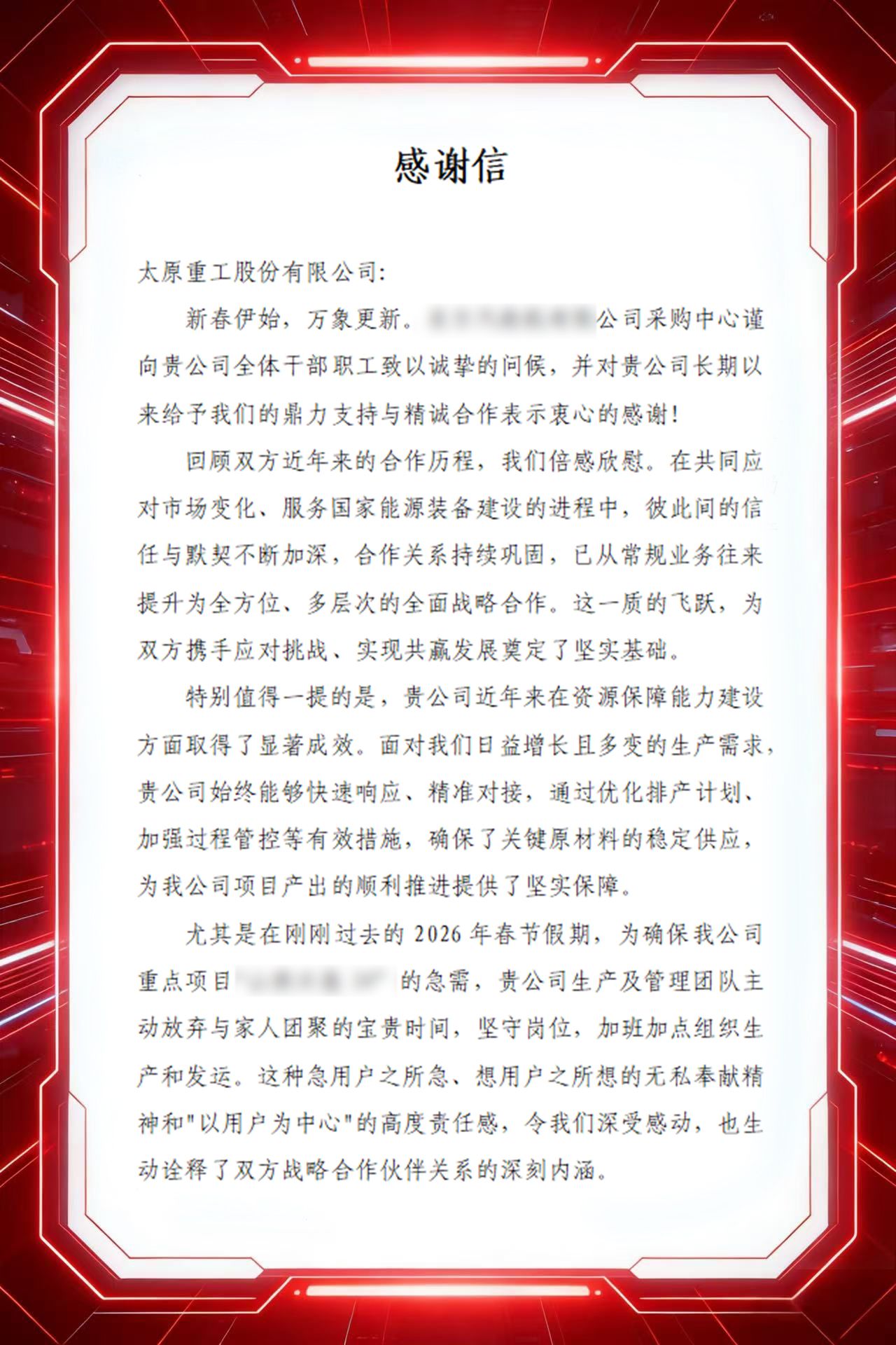 “貴公司始終能夠快速響應、精準對接,通過優(yōu)化排產(chǎn)計劃、加強過程管控等有效措施,確保了關(guān)鍵原材料的穩(wěn)定供應?!?/span>