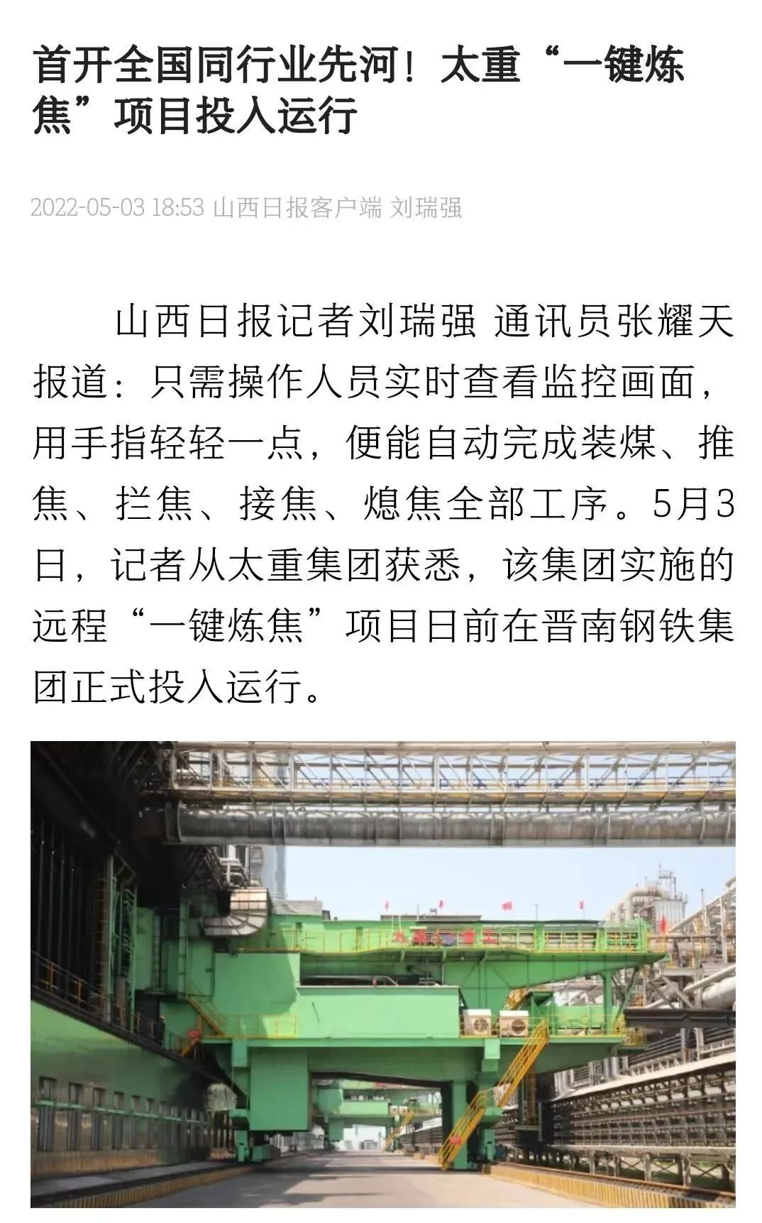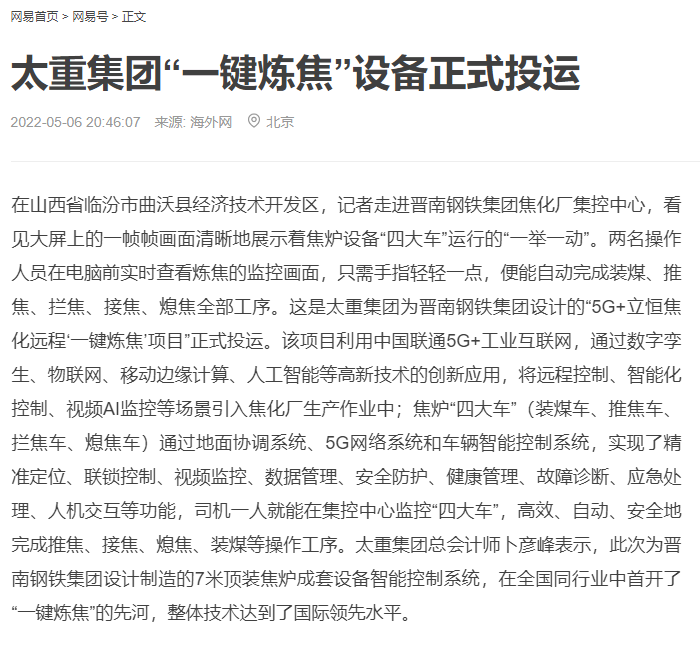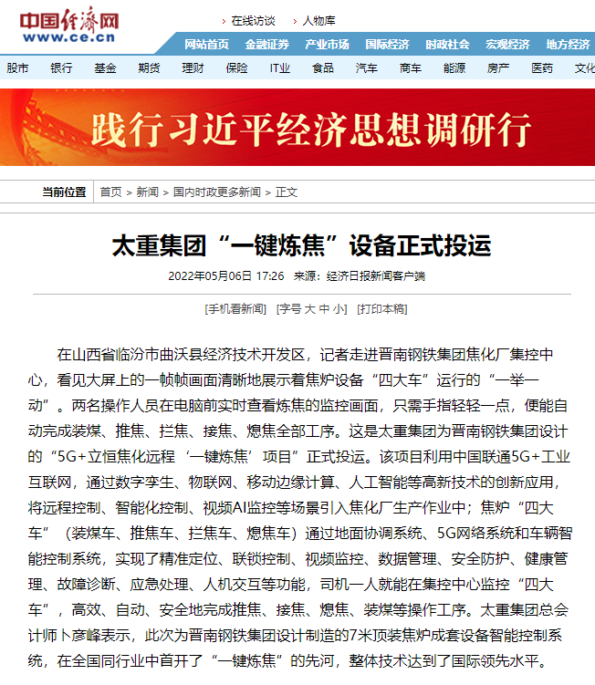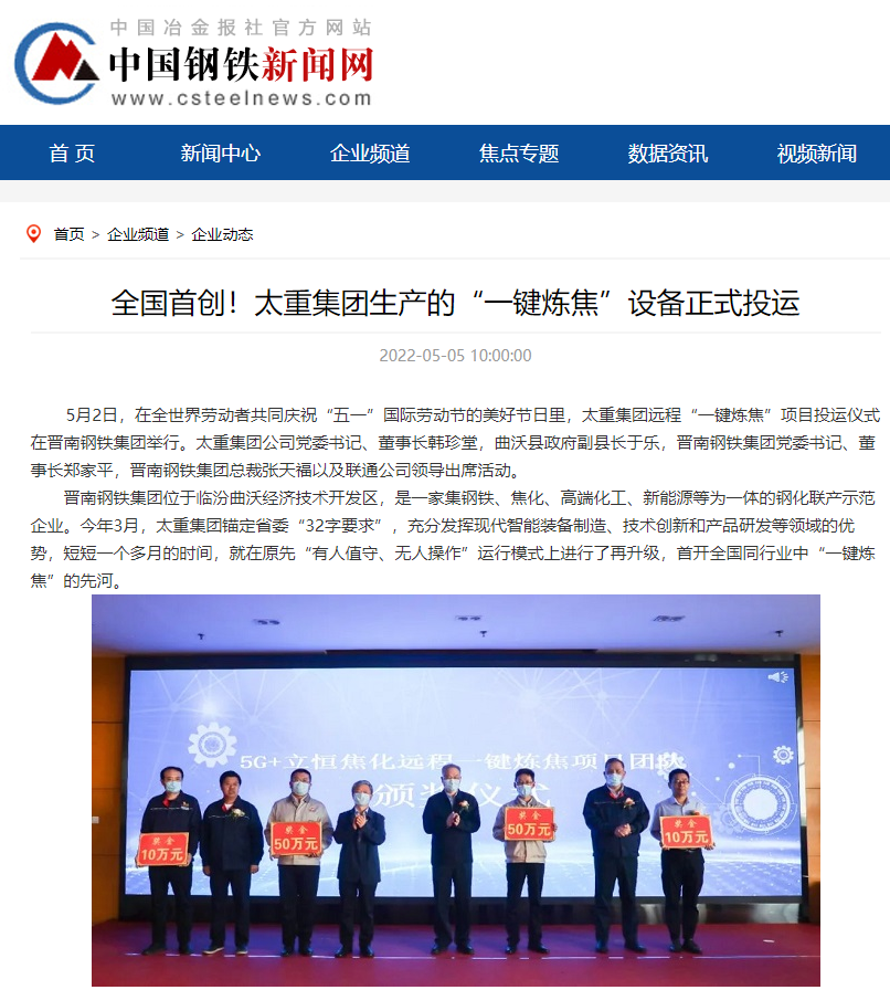 央廣網(wǎng)、中國鋼鐵新聞網(wǎng)、騰訊以《全國首創(chuàng)!太重集團“一鍵煉焦”設(shè)備正式投運》為題,聚焦太重集團以科技創(chuàng)新激發(fā)“智造”新活力為出發(fā)點,全面展示“智能+5G”在“一鍵煉焦”上的應(yīng)用,助力焦化領(lǐng)域效能提升、節(jié)能降耗和轉(zhuǎn)型升級。中國經(jīng)濟網(wǎng)、網(wǎng)易、山西國資以《太重集團“一鍵煉焦”設(shè)備正式投運》為題,報道太重集團“一鍵煉焦”項目正式開啟智能煉焦新時代,填補技術(shù)空白,開創(chuàng)國內(nèi)焦化行業(yè)先河。搜狐網(wǎng)以《環(huán)境好了,效率高了,收益漲了!太重首創(chuàng)“一鍵煉焦”項目投運》為題,重點展示了太重集團“一鍵煉焦”項目成果,實現(xiàn)智能綠色工廠轉(zhuǎn)型再升級。山西日報、山西晚報、太原日報分別以《首開全國同行業(yè)先河!太重“一鍵煉焦”項目投入運行》《太重大發(fā)明:動動手指“一鍵煉焦”》《太重首創(chuàng)“一鍵煉焦”項目投運》為題,聚焦太重“智造”再提速,充分展現(xiàn)公司以“三性五化”為新產(chǎn)品開發(fā)目標(biāo),助力國家實現(xiàn)“雙碳”目標(biāo)。