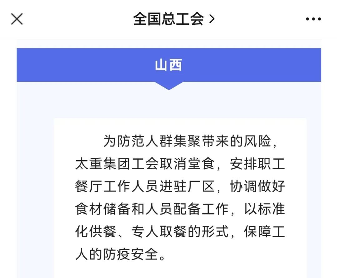 為防范人群集聚帶來(lái)的風(fēng)險(xiǎn),太重集團(tuán)工會(huì)取消堂食,安排職工餐廳工作人員進(jìn)駐廠區(qū),協(xié)調(diào)做好食材儲(chǔ)備和人員配備工作,以標(biāo)準(zhǔn)化供餐、專人取餐的形式,保障工人的防疫安全。