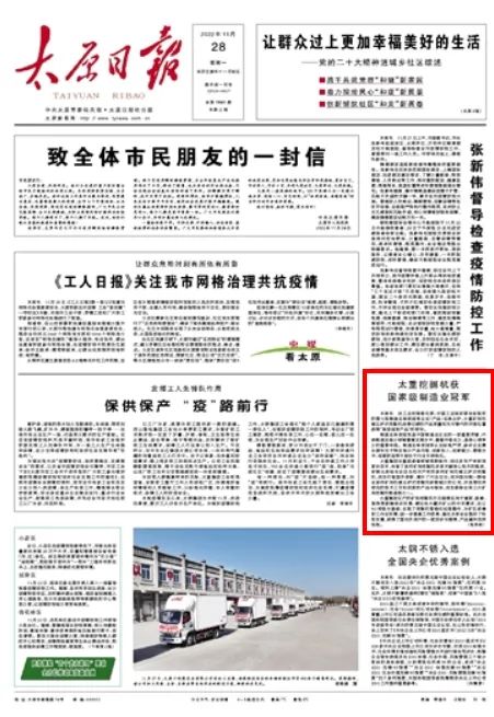 11月28日,太原日?qǐng)?bào)頭版以《太重挖掘機(jī)獲國(guó)家級(jí)制造業(yè)冠軍》為題對(duì)太重集團(tuán)進(jìn)行報(bào)道。深化改革以來(lái),太重集團(tuán)深耕重型裝備領(lǐng)域,擔(dān)當(dāng)高端裝備制造“鏈主”責(zé)任,加大前沿技術(shù)研發(fā)和關(guān)鍵核心技術(shù)攻關(guān)力度,加快轉(zhuǎn)型升級(jí)步伐,為公司高質(zhì)量高速度發(fā)展提供“硬核”力量。