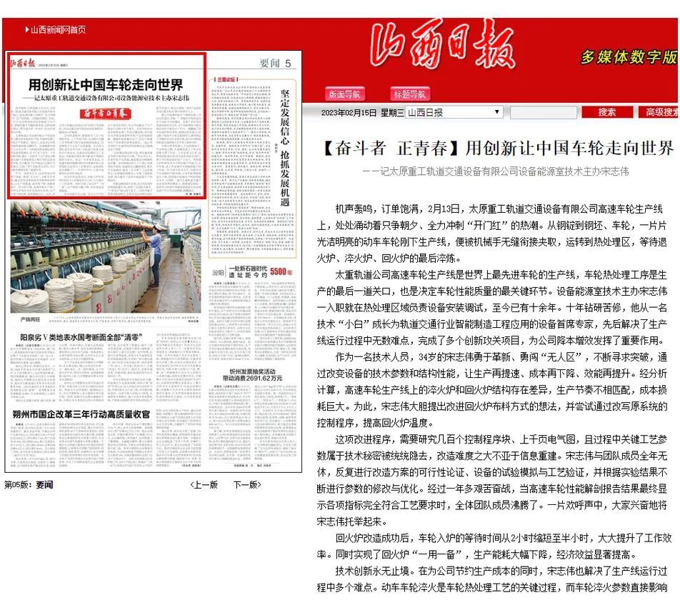 今天的《山西日?qǐng)?bào)》對(duì)太重軌道交通公司設(shè)備能源室技術(shù)主辦宋志偉帶領(lǐng)創(chuàng)新團(tuán)隊(duì),在太重高質(zhì)量高速度發(fā)展進(jìn)程中,以永不懈怠的奮進(jìn)姿態(tài)做出突出貢獻(xiàn)的生動(dòng)事跡進(jìn)行了聚焦報(bào)道。