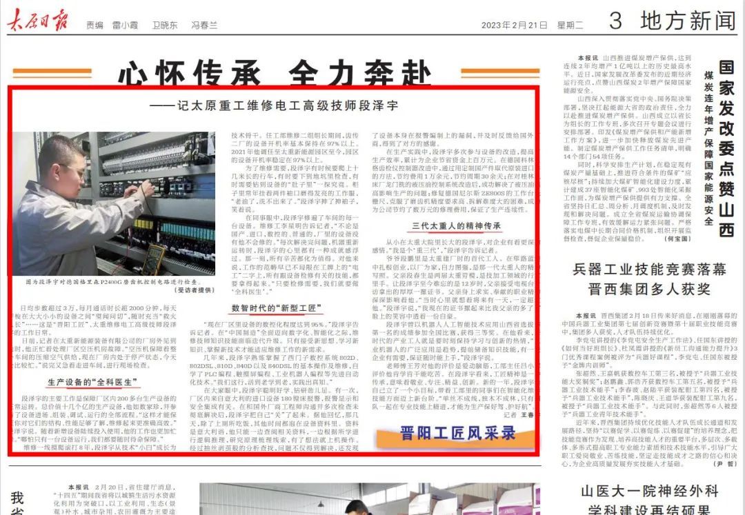 日前,太重集團齒輪傳動分公司電工段澤宇榮獲了太原市第四屆“晉陽工匠”榮譽稱號。《太原日報》于日前對其事跡進(jìn)行了宣傳報道。