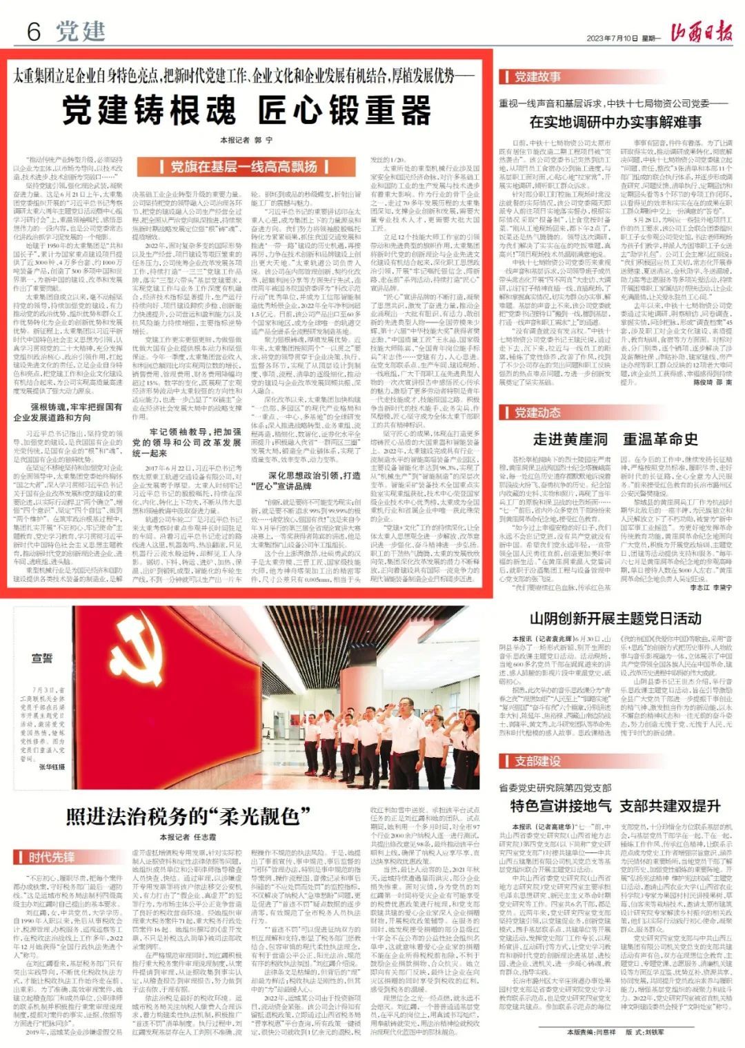 今天,山西日報刊發(fā)《黨建鑄根魂 匠心鍛重器》文章,聚焦太重集團以習(xí)近平新時代中國特色社會主義思想為指引,認(rèn)真學(xué)習(xí)貫徹黨的二十大精神,充分發(fā)揮黨組織政治核心、政治引領(lǐng)作用,扛起建設(shè)先進文化的責(zé)任,立足企業(yè)自身特色和亮點,把新時代黨建工作和企業(yè)文化建設(shè)有機結(jié)合起來,實現(xiàn)高質(zhì)量高速度發(fā)展,向著建設(shè)具有國際一流競爭力的現(xiàn)代智能裝備制造企業(yè)目標(biāo)闊步邁進。