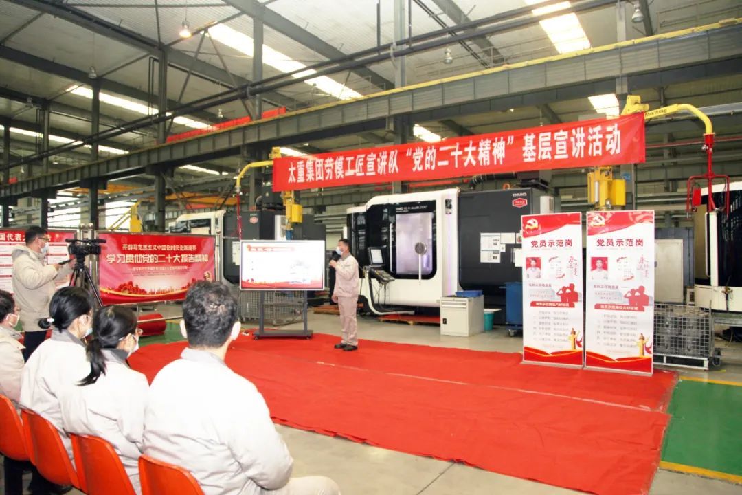 在太重榆液液壓泵分廠車間現(xiàn)場,伴隨著機器的轟鳴聲,黨的二十大精神宣講活動也正在火熱進行中。集團公司“勞模工匠”宣講隊成員,山西省勞動模范、省級勞模創(chuàng)新工作室?guī)ь^人常永紅,正在為他的工友們宣講黨的二十大精神。生產車間既是他每天工作戰(zhàn)斗的地方,也是他宣講黨的創(chuàng)新理論的陣地。他結合崗位實際談心得、說體會、講感受,推動黨的二十大精神走進基層一線、走進職工心里,唱響新時代奮斗者之歌。